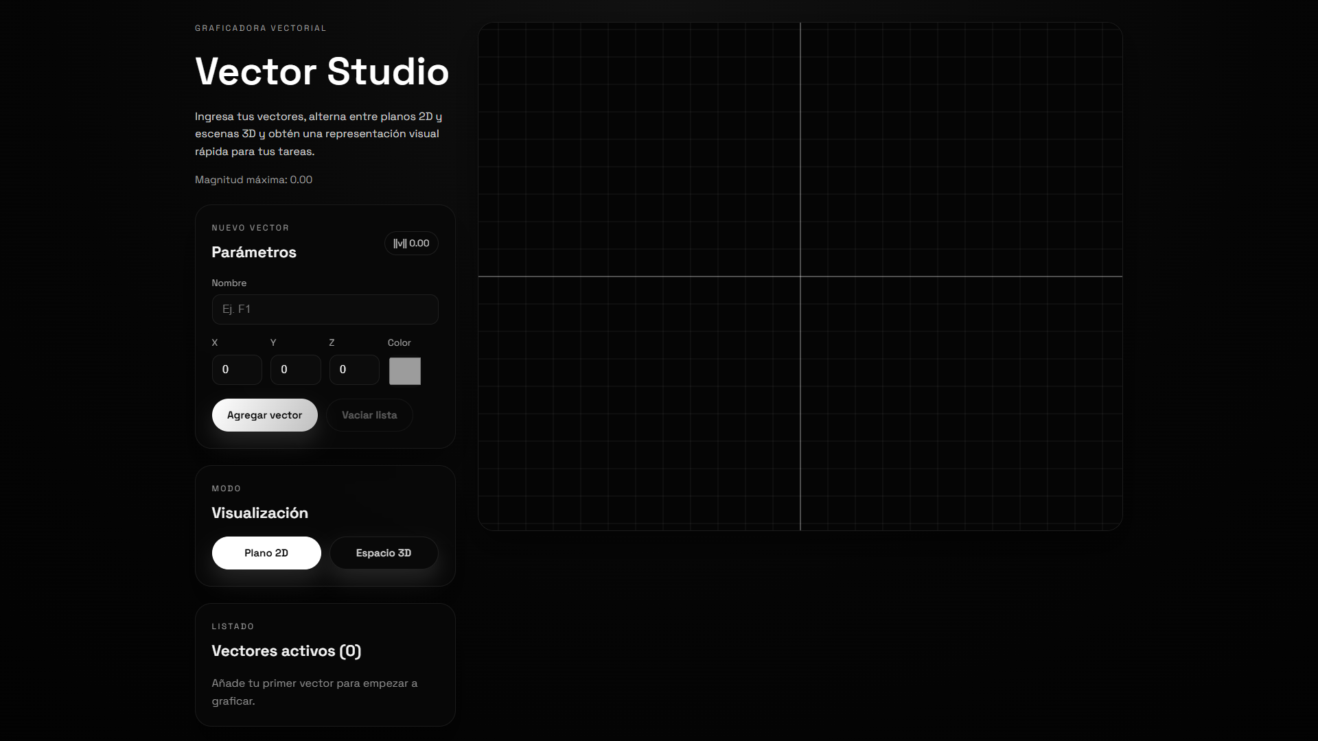 PropioAplicación para graficar vectores en 2D y 3D, con parámetros personalizables y visualización en tiempo real.