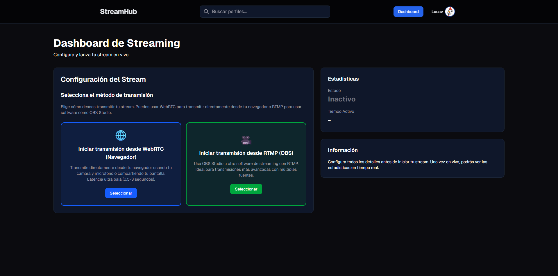 En equipoDashboard de streaming para configurar y lanzar transmisiones en vivo. Soporta WebRTC (desde el navegador) y RTMP (OBS Studio), con estadísticas en tiempo real.